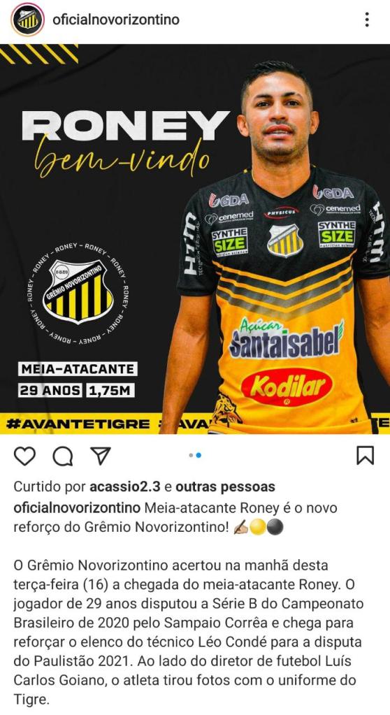 Divulgado pelo Sampaio como nome renovado para 2021, o atacante Roney foi anunciado nesta terça-feira (16) pelo Novorizontino-SP. Em uma coletiva, o presidente do Sampaio chegou a falar em tom de ultimato a respeito da ausência do atletas durante os treinamentos.