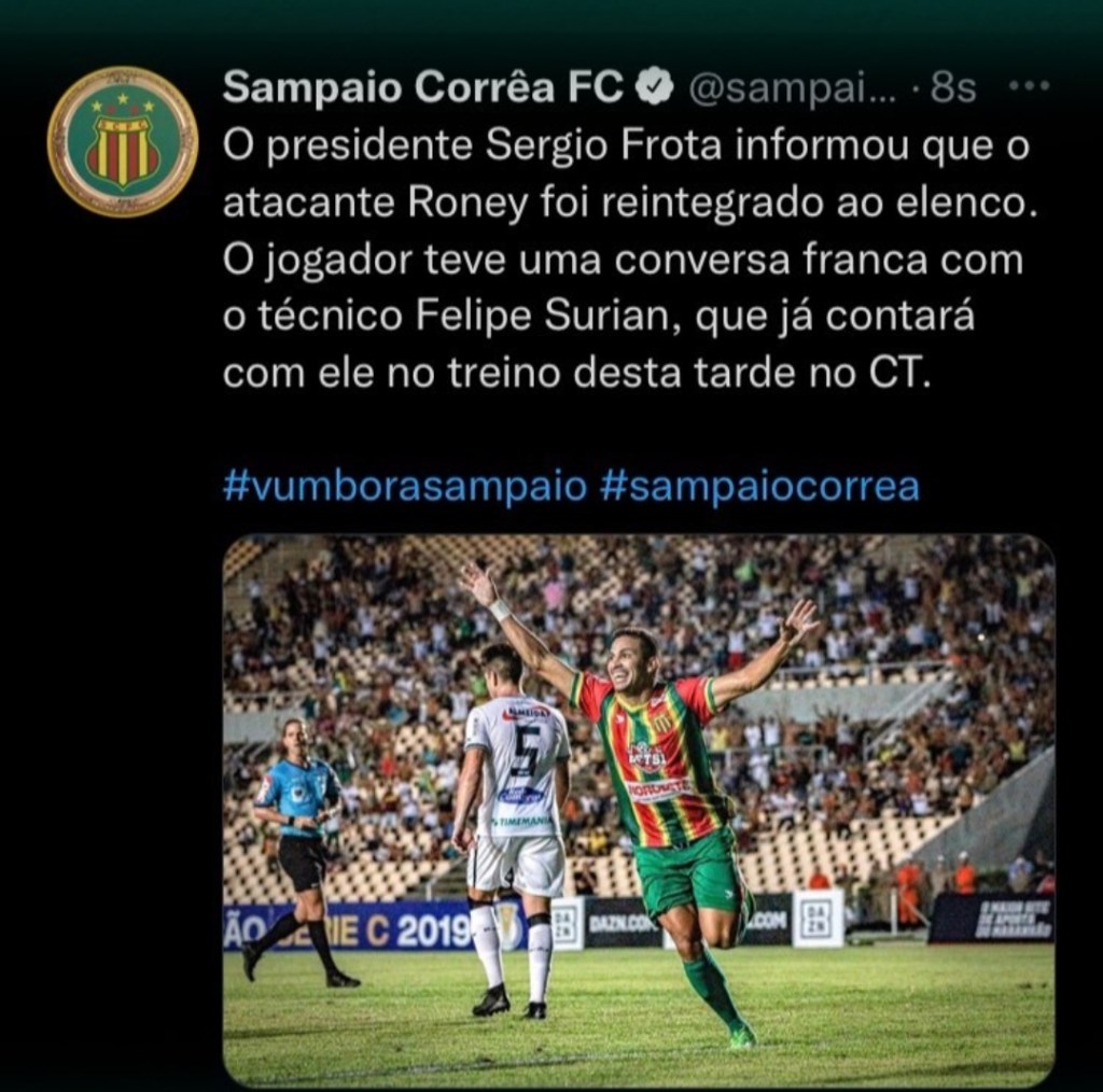 O Sampaio Corrêa desistiu de emprestar o atacante Roney para o Fluminense-PI. Depois de ter anunciado a saída do atleta por conta de problemas disciplinares, o clube divulgou em sua redes sociais o “retorno” do jogador.