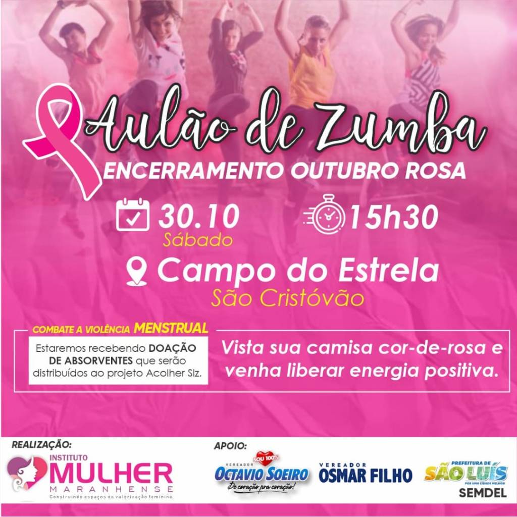 Em alusão à Campanha Outubro Rosa, o Instituto Mulher Maranhense promove uma “Tarde Diferente” com um aulão de zumba e palestra. A iniciativa tem como objetivo conscientizar a sociedade sobre a importância da prevenção e do diagnóstico precoce da doença.