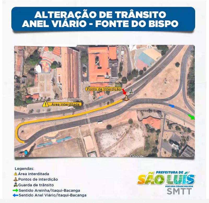 O local corresponde ao retorno de veículos que circulam no sentido de quem vem do bairro Areinha (Rádio São Luís), indo para a área Itaqui-Bacanga. Com a interdição, esse fluxo de veículos será transferido para o trecho em frente à Capela de São Pedro. A ação de mudança do retorno será feita com a retirada dos blocos de concreto (gelo baiano) do local e liberação temporária da via.