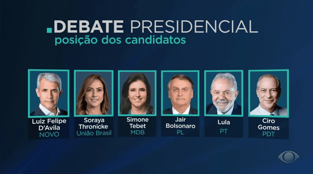 O evento colocará frente a frente, pela primeira vez, os principais candidatos ao Planalto: Luiz Inácio Lula da Silva (PT), Jair Bolsonaro (PL), Ciro Gomes (PDT), Simone Tebet (PMDB), Felipe D’Avila (Novo) e Soraya Thronicke (União Brasil).